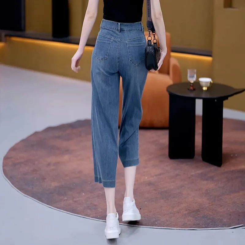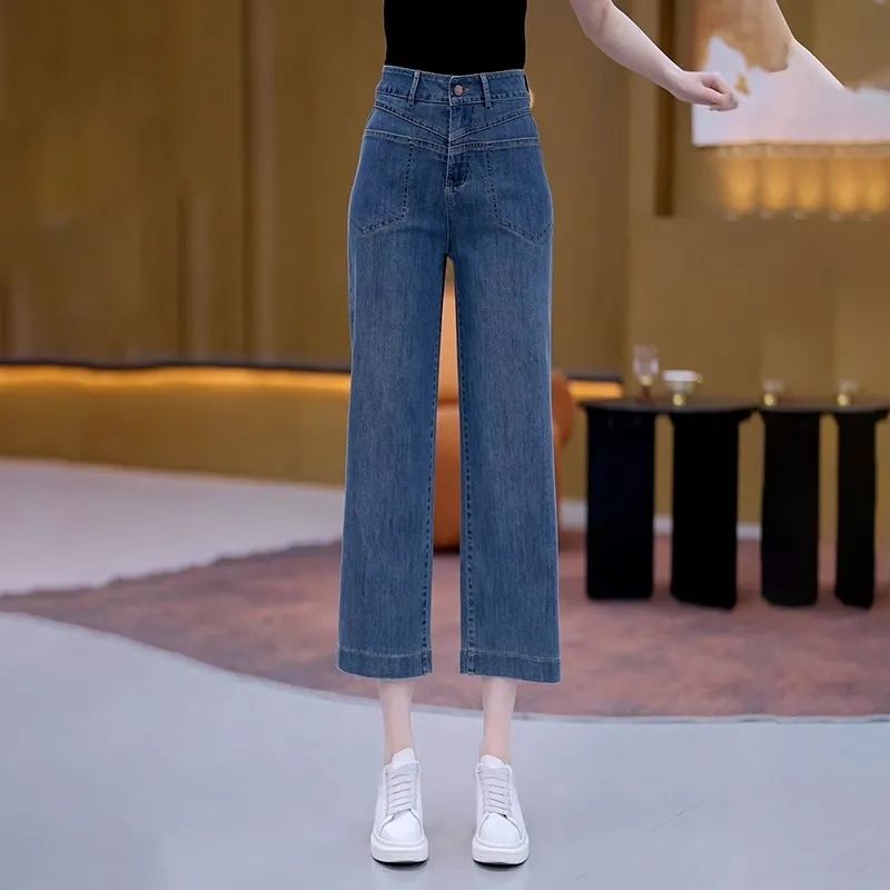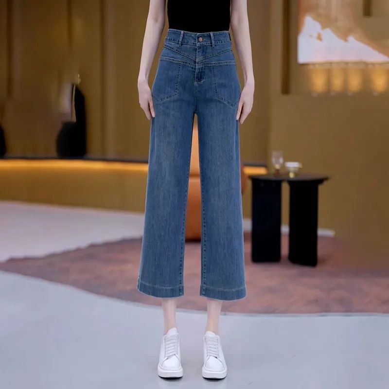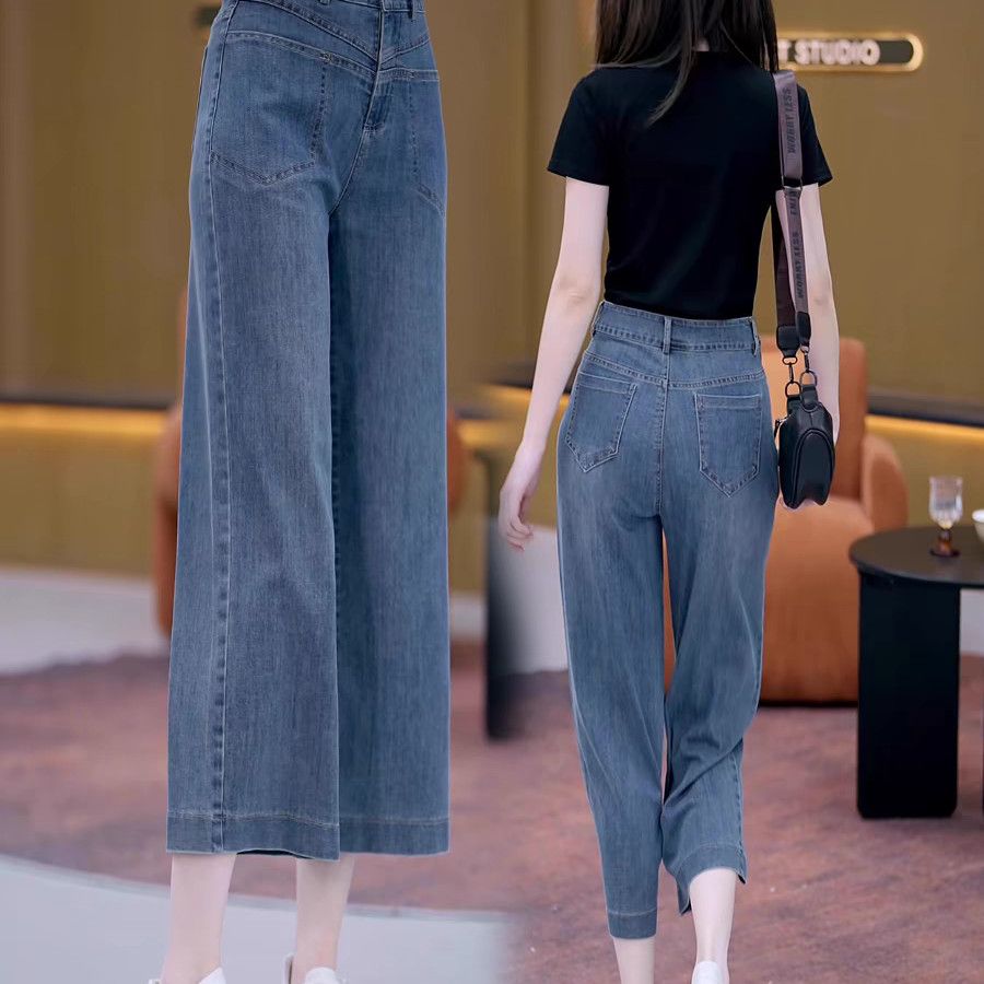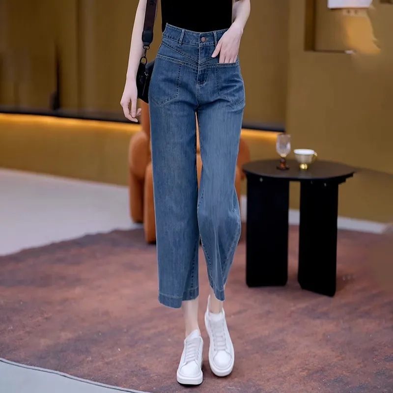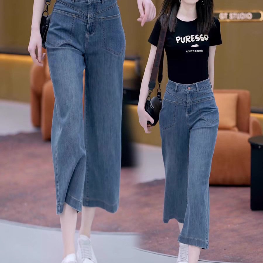 高腰宽松八分阔腿牛仔裤女夏季2025新款薄款外穿显瘦直筒九分裤子