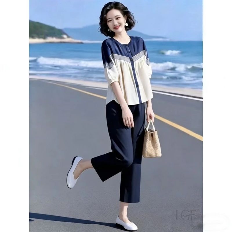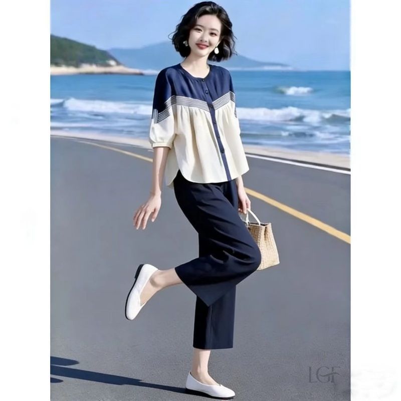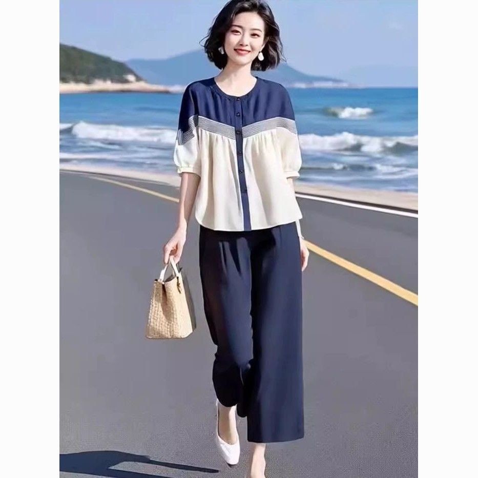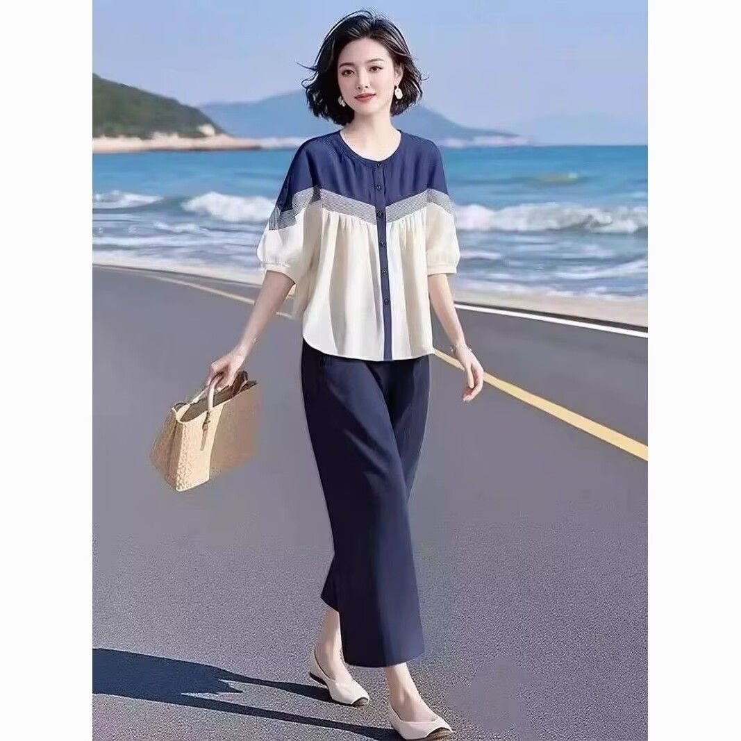 素雅女装原创品牌订制复古洋气拼接宽松衬衫松紧腰九分阔腿裤套装