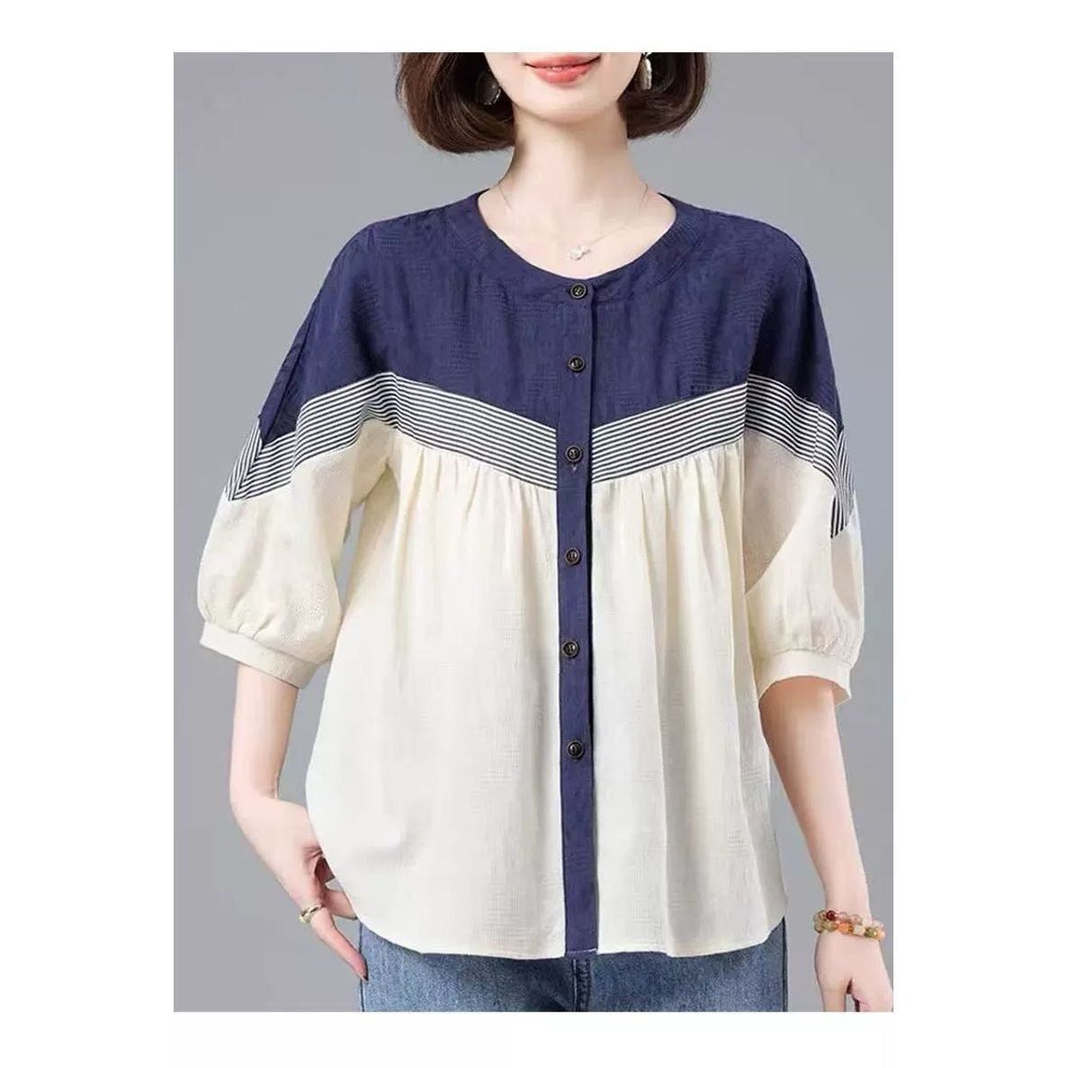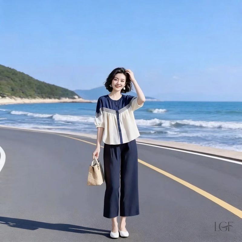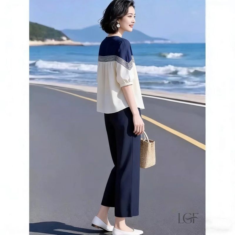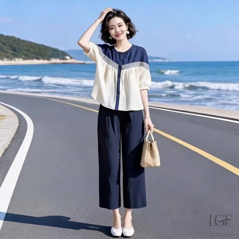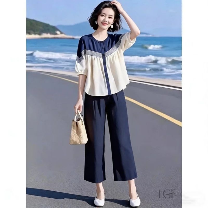 素雅女装原创品牌订制复古洋气拼接宽松衬衫松紧腰九分阔腿裤套装